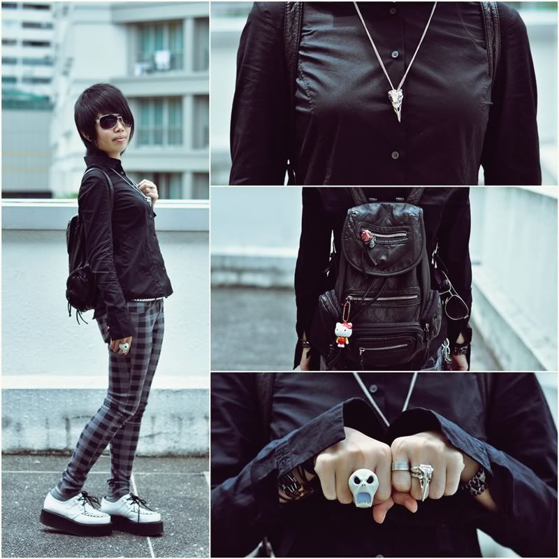 ![]() Proper OoTD, photographed by my friend! My shirt looks creased because of elbow movements. Top - G2000 | Pants - F21 | Creepers - Demonia | Bag - Rubi | Crow skull necklace/ring - Tooabsorb | NbC ring - Gachapon March is and will be a pretty rushed month. I have nothing to say except that my assignments are weighing at on-the-damned-right-track or not-started-at-fucking-all extremes. 5 weeks more, just 35 days more. Other than assignments, my classmates and I have been doing whacky stuff in class. It's gonna be quite sad when we split into our diploma classes next school year come August! At least we'll still be studying on the same campus. One thing I like about my school is the random flea markets... because one stall will always be selling books. I'm so glad I bought a new book! Nothing really caught my eye until we saw this :) Not that I want to draw "dark" stuff, but the cover/typography was really appealing, and the inside was like rainbow puke. I'm not even kidding although I don't sound as hyped as I should be... ![]() "Dark is unpleasant at large. It makes you feel unsafe and uncertain when things are out of reach in the absence of light and you know shady areas are where devils, despair and immortal things belong." |